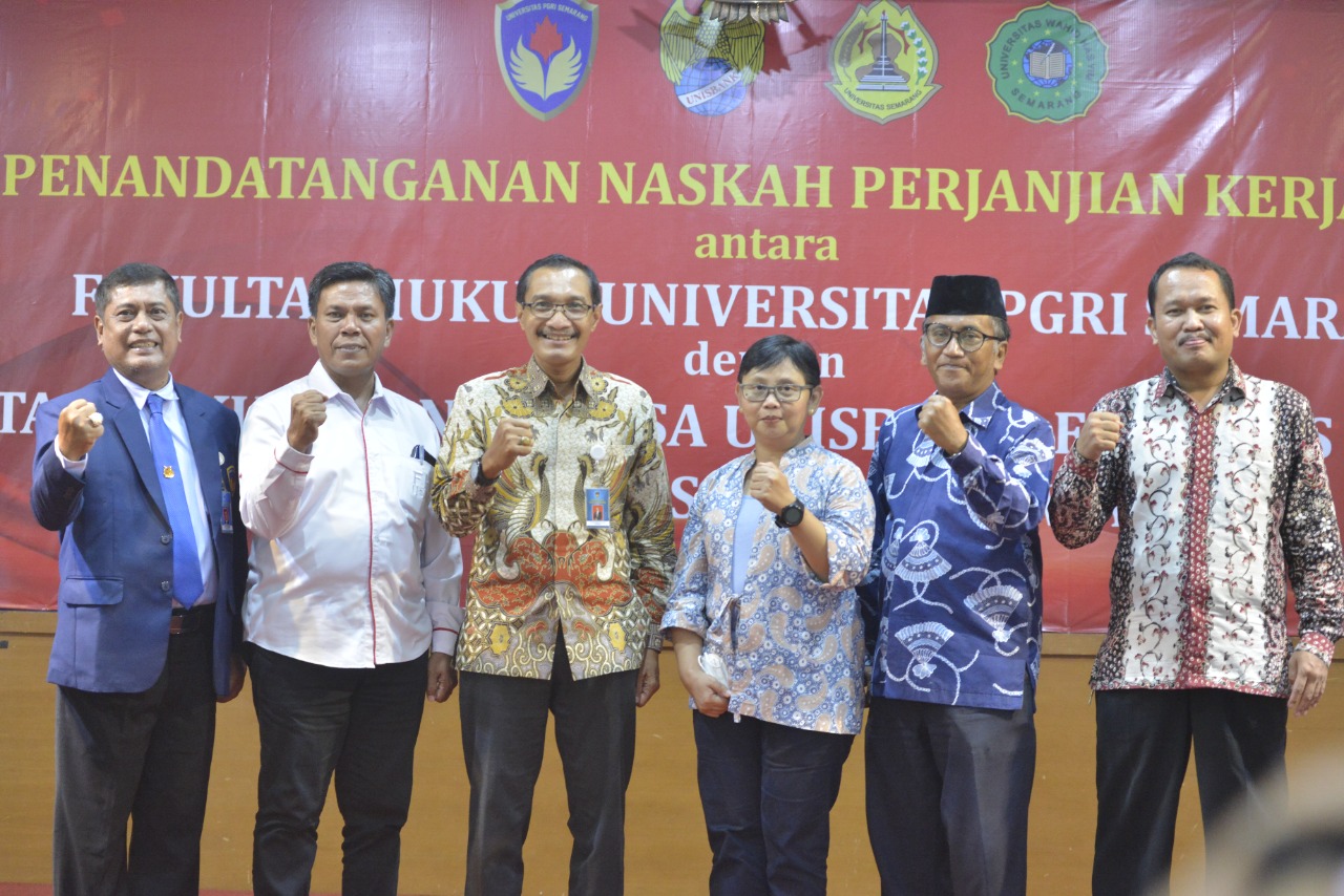 Penandatanganan Naskah Kerja Sama tersebut melibatkan Fakultas Hukum UPGRIS, yang ditandatangai juga oleh tiga dekan dari fakultas hukum dari tiga universitas, yaitu Dekan FH Universitas Semarang Dr. Amri Panahatan Sihotang, S.S., S,H,. M.Hum, Dekan FH Unisbank Dr. Agnes Widyaningrum, S.E., S.Pd., M.Pd, dan Dekan FH Universitas Wahid Hasyim Dr. Mastur, S.H., M.H.