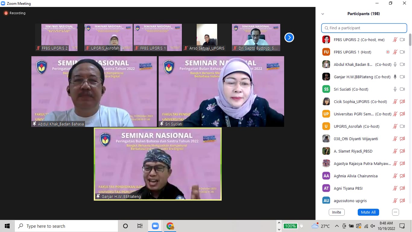“Pada dasarnya pengguna bahasa berusaha semudah dan seminim mungkin menggunakan tenaga ketika berbahasa melalui penghematan dalam penggunaan unsur-unsur kebahasaan,” ungkap Rektor UPGRIS Dr. Sri Suciati, M.Hum, dalam Seminar Nasional dalam rangka peringatan bulan bahasa dan sastra tahun 2022, yang diselenggarakan oleh Fakultas Pendidikan Bahasa dan Seni, Universitas PGRI Semarang pada 19 Oktober 2022 secara daring.