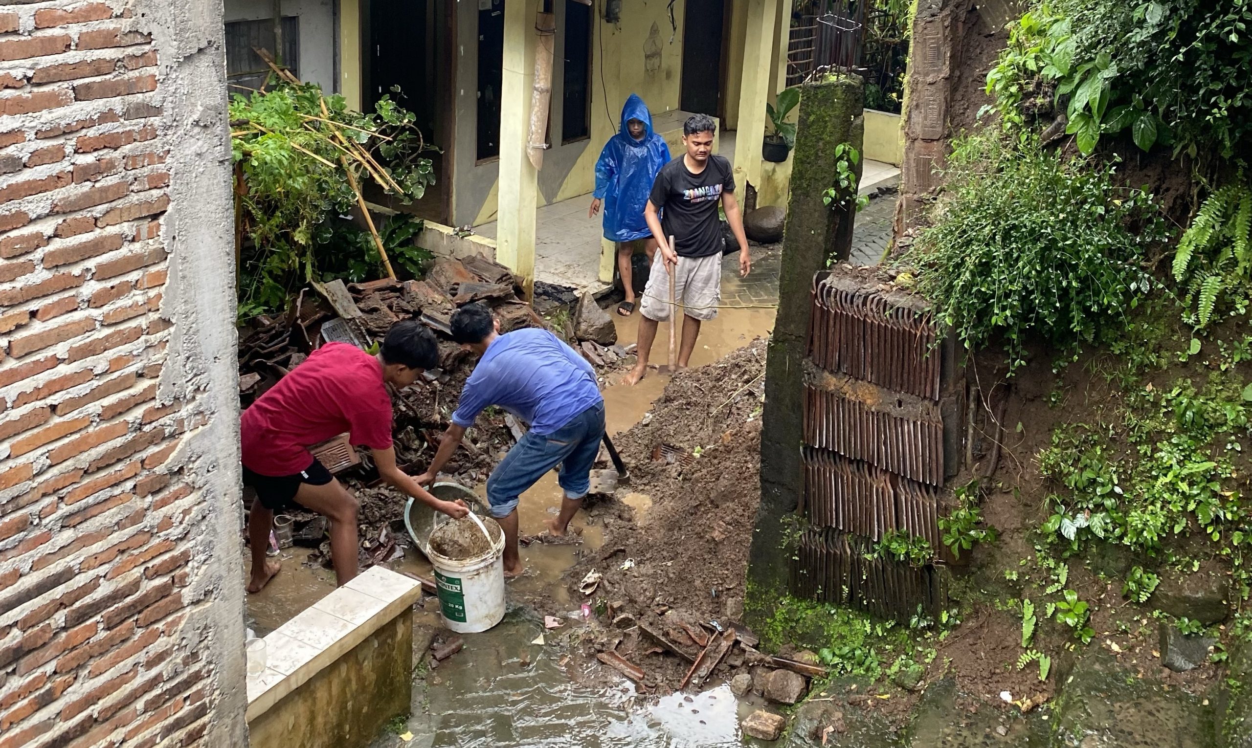 Proses pembersihan dilakukan secara manual menggunakan peralatan sederhana seperti cangkul dan sekop. Mahasiswa dan warga bekerja secara bergantian dengan tetap memperhatikan keselamatan, mengingat potensi longsor susulan masih ada selama hujan berlangsung.