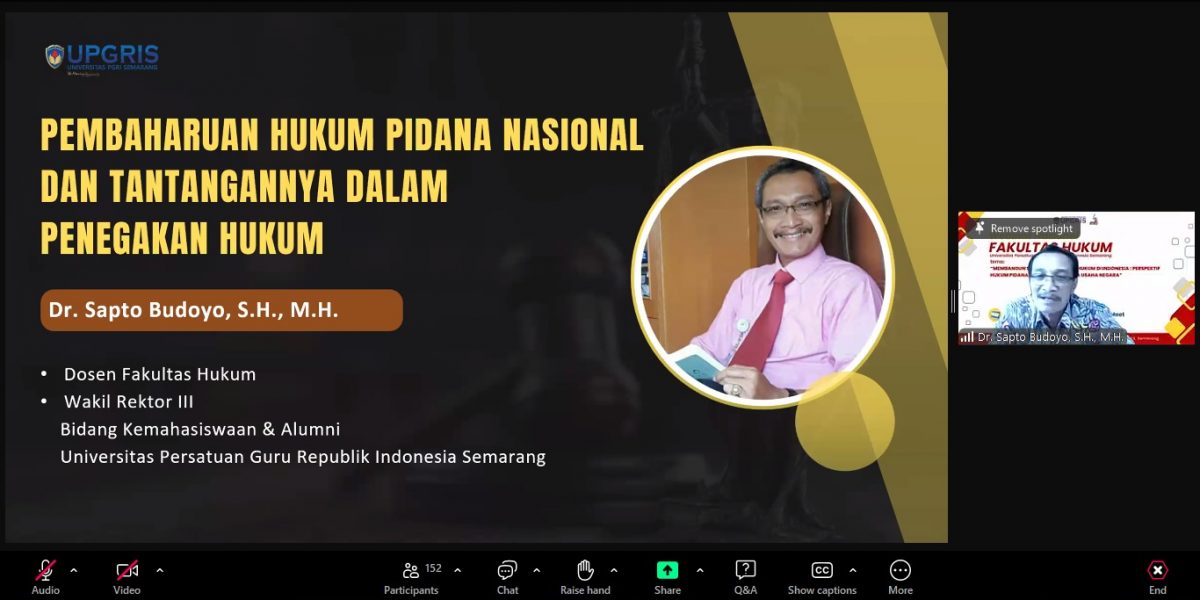 Webinar ini diikuti oleh 129 mahasiswa Fakultas Hukum Universitas PGRI Semarang, menghadirkan tiga pakar hukum sebagai narasumber utama: Dr. Sapto Budoyo, S.H., M.H. Temanya Pembaharuan Hukum Pidana Nasional dan Tantangannya dalam Penegakan Hukum yang membahas implikasi perubahan KUHP nasional terhadap sistem hukum pidana dan peradilan di Indonesia. Dr. Wahyu Widodo, S.H., M.Hum. Acara ini mengupas pentingnya kontrol yudisial dan perlindungan hak atas keputusan administrasi pemerintahan pasca reformasi regulasi.