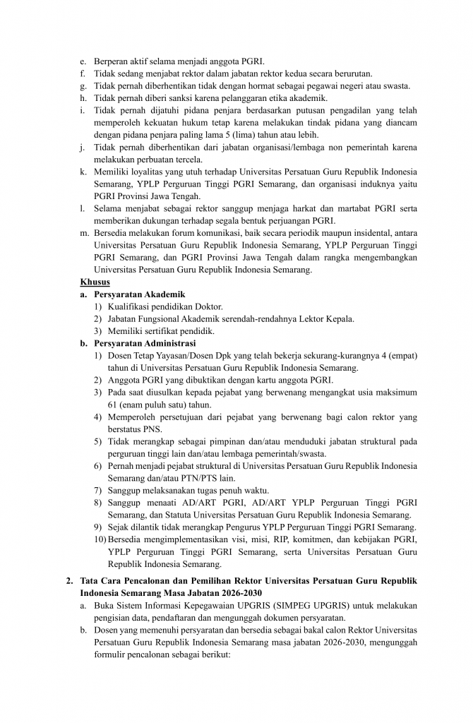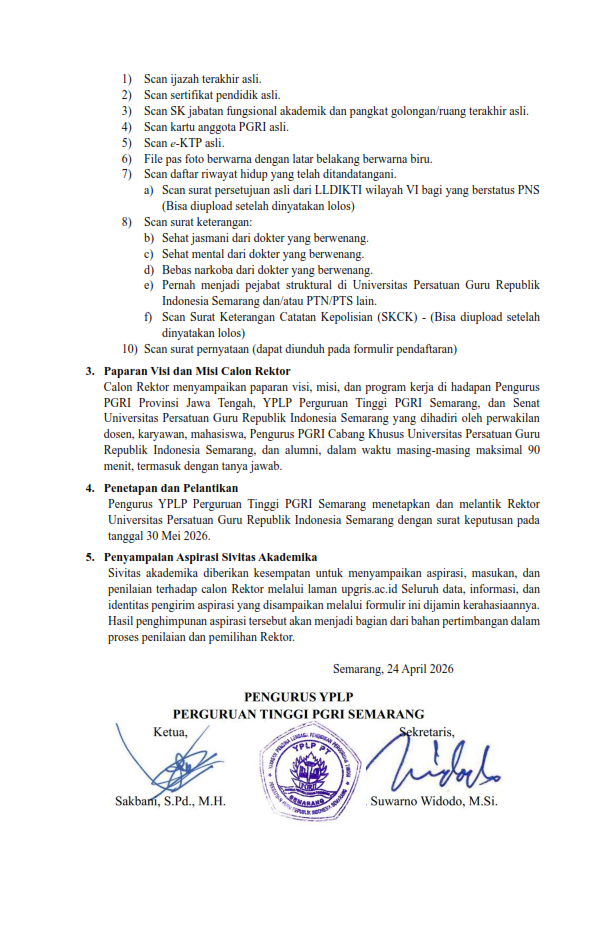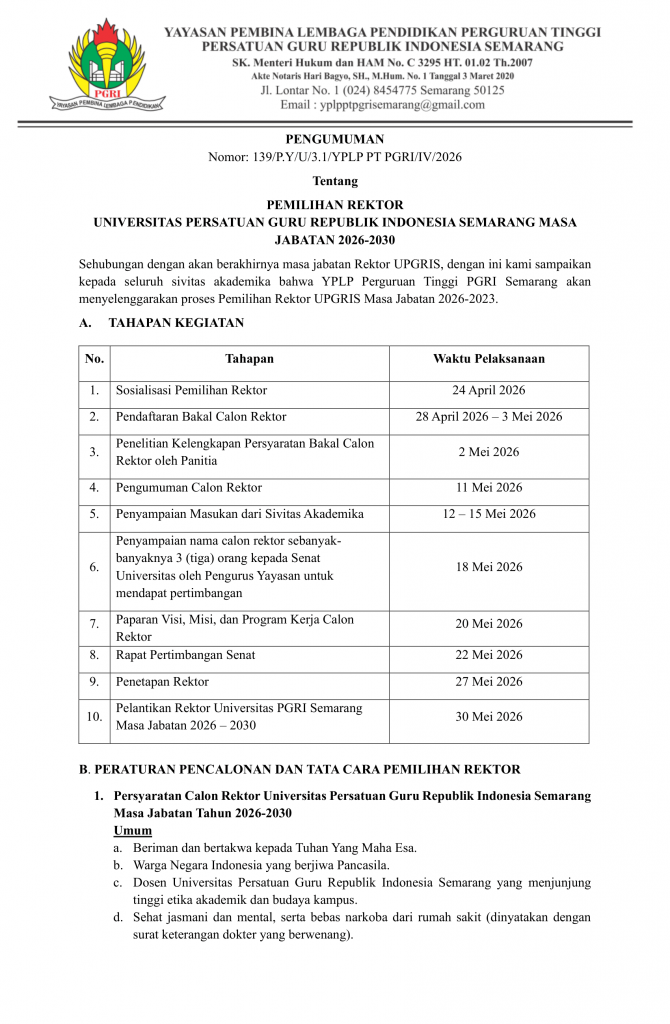 Pengumuman Pemilihan Rektor Universitas Persatuan Guru Republik Indonesia Masa Jabatan 2026-2030