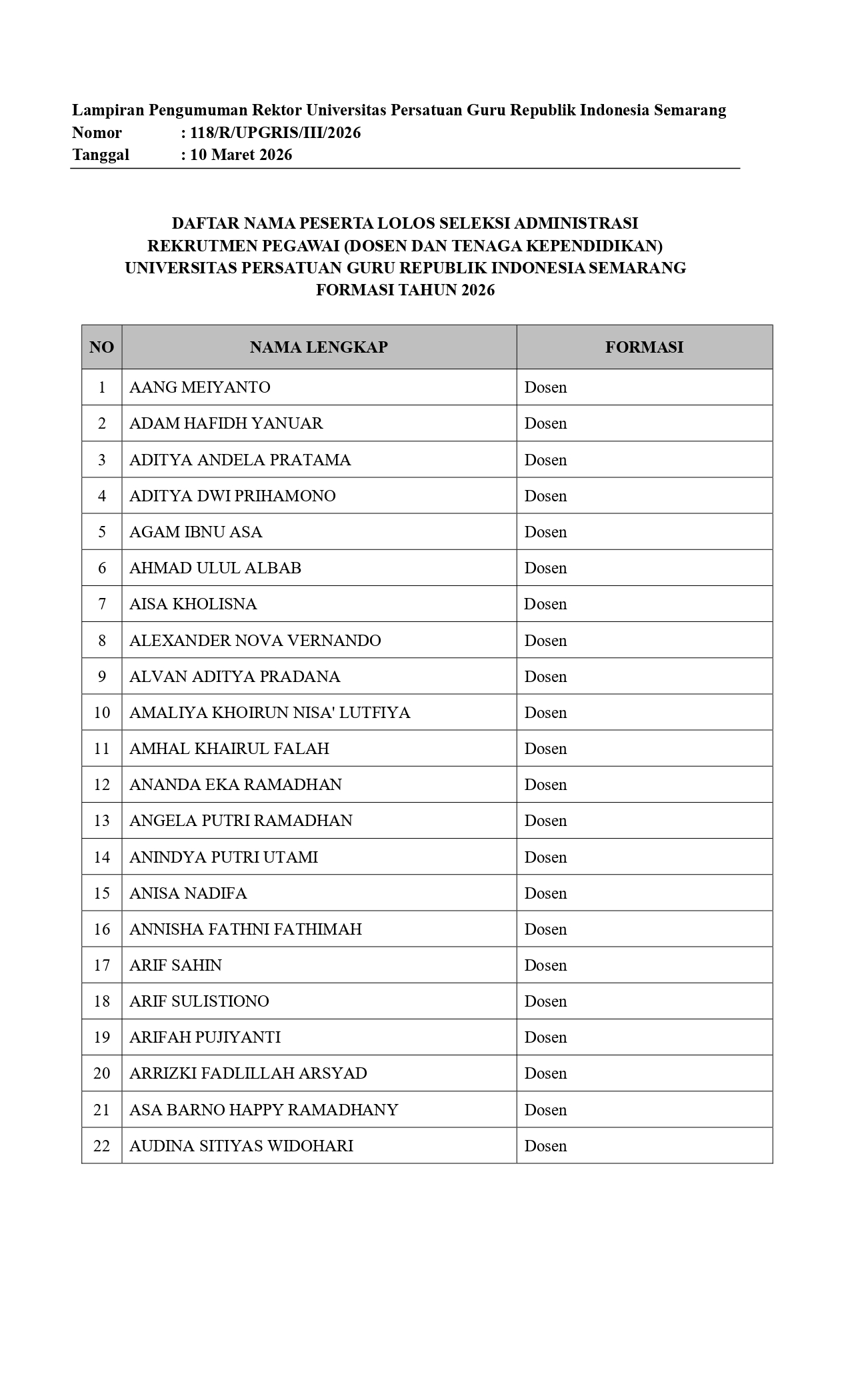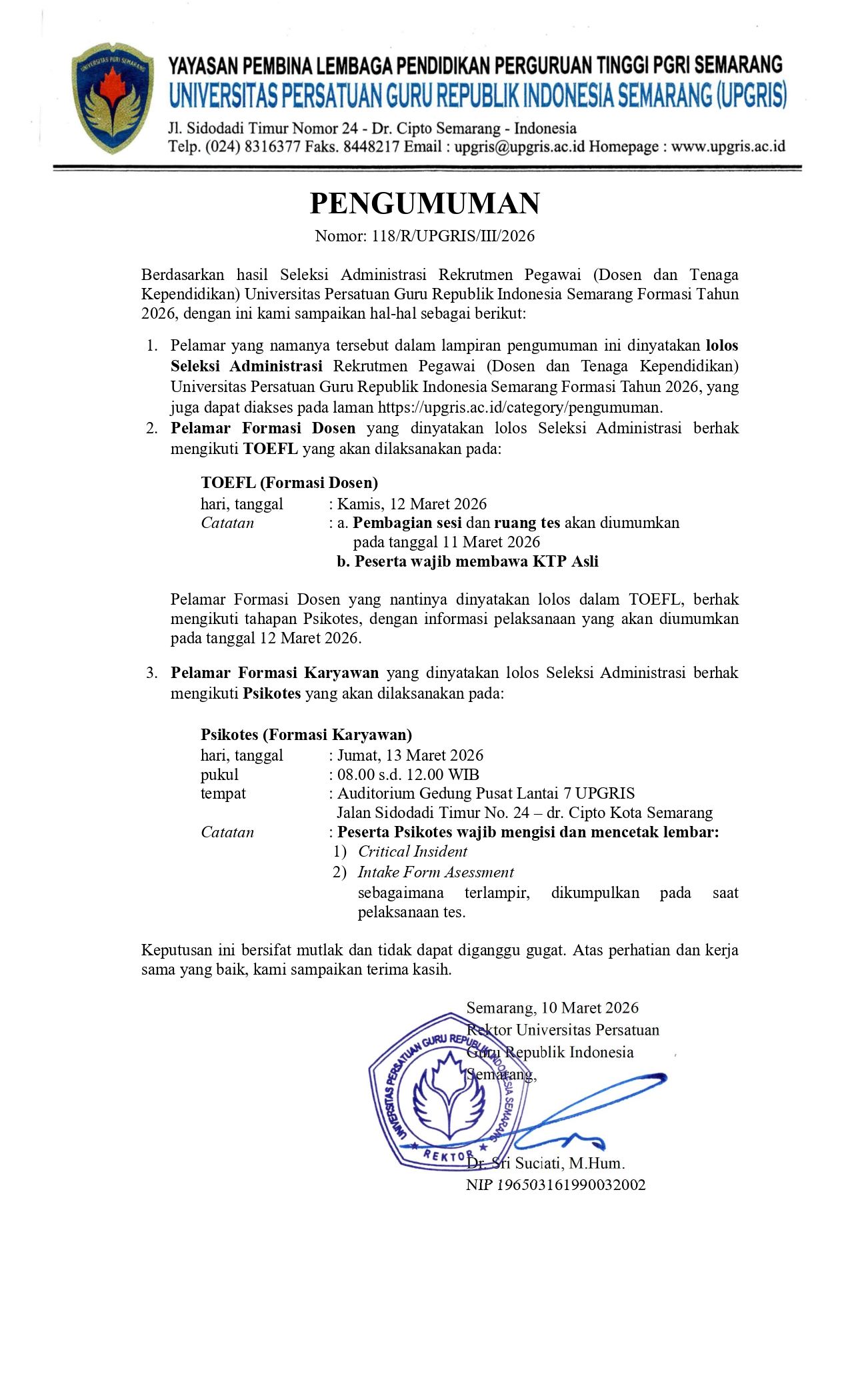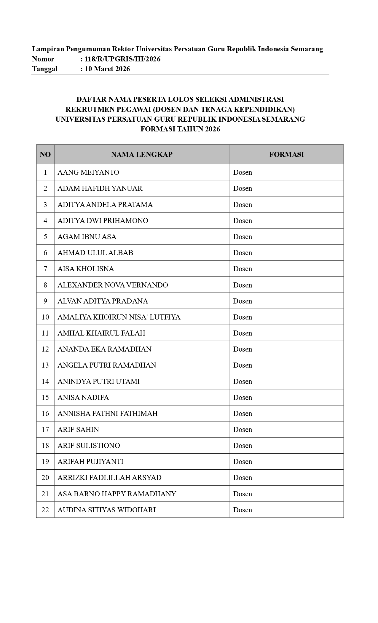 Bersama ini kami sampaikan Surat Rektor Universitas Persatuan Guru Republik Indonesia Semarang Nomor 118/R/UPGRIS/2026 tertanggal 10 Maret 2026 tentang Pengumuman Seleksi Administrasi Rekrutmen Pegawai Universitas Persatuan Guru Republik Indonesia Semarang Formasi Tahun 2026 sebagaimana terlampir.