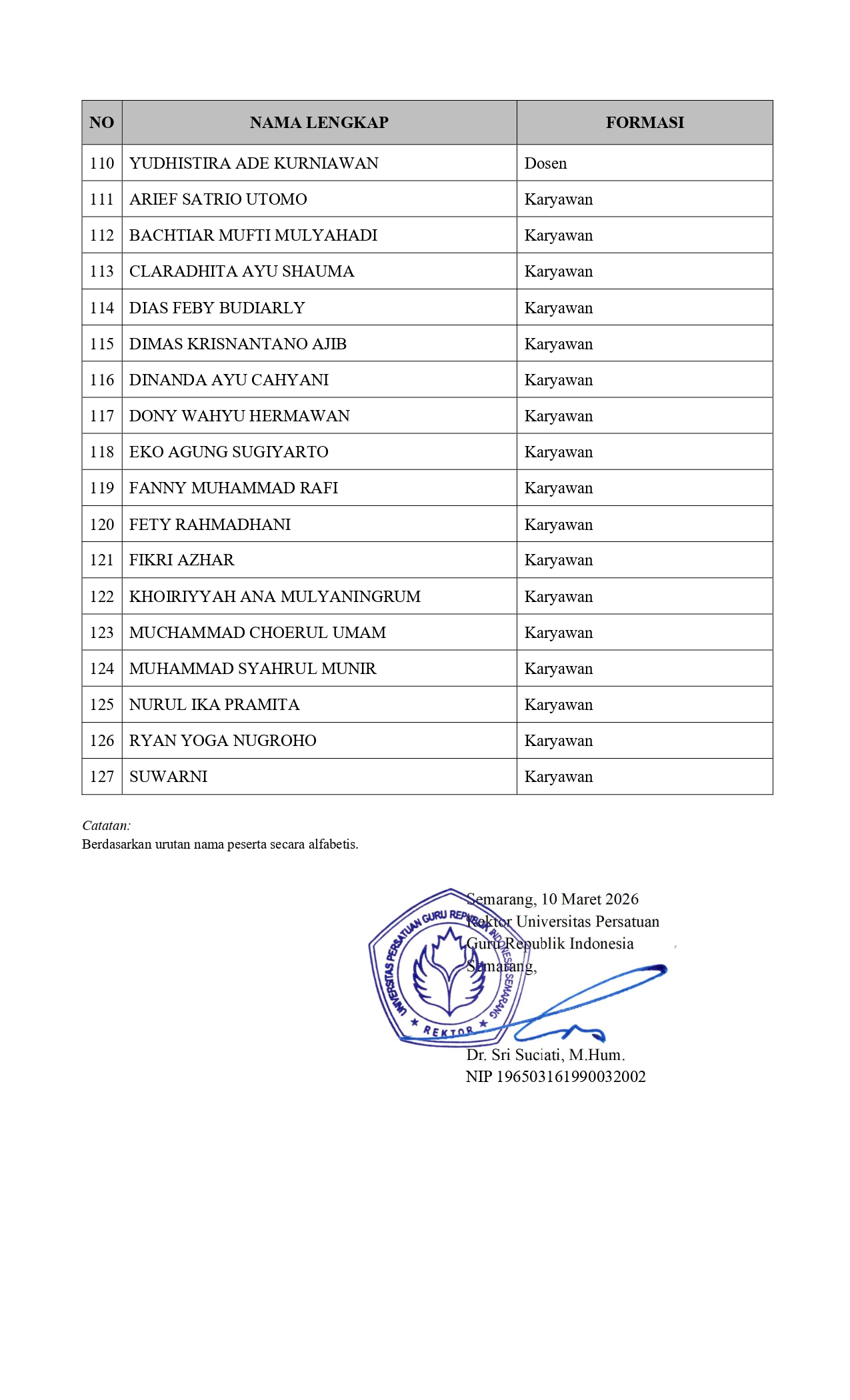 PENGUMUMAN SELEKSI ADMINISTRASI REKRUTMEN PEGAWAI UNIVERSITAS PERSATUAN GURU REPUBLIK INDONESIA SEMARANG FORMASI TAHUN 2026