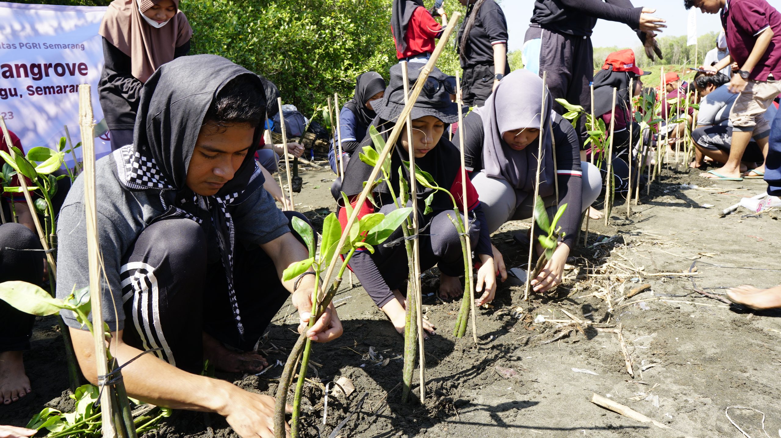 Students participating in Kemendikbudristek’s Inbound Student Exchange program planted 5,000 mangrove trees at Mangunharjo North Beach, Tugu, Semarang City, Saturday, January 7, 2023.