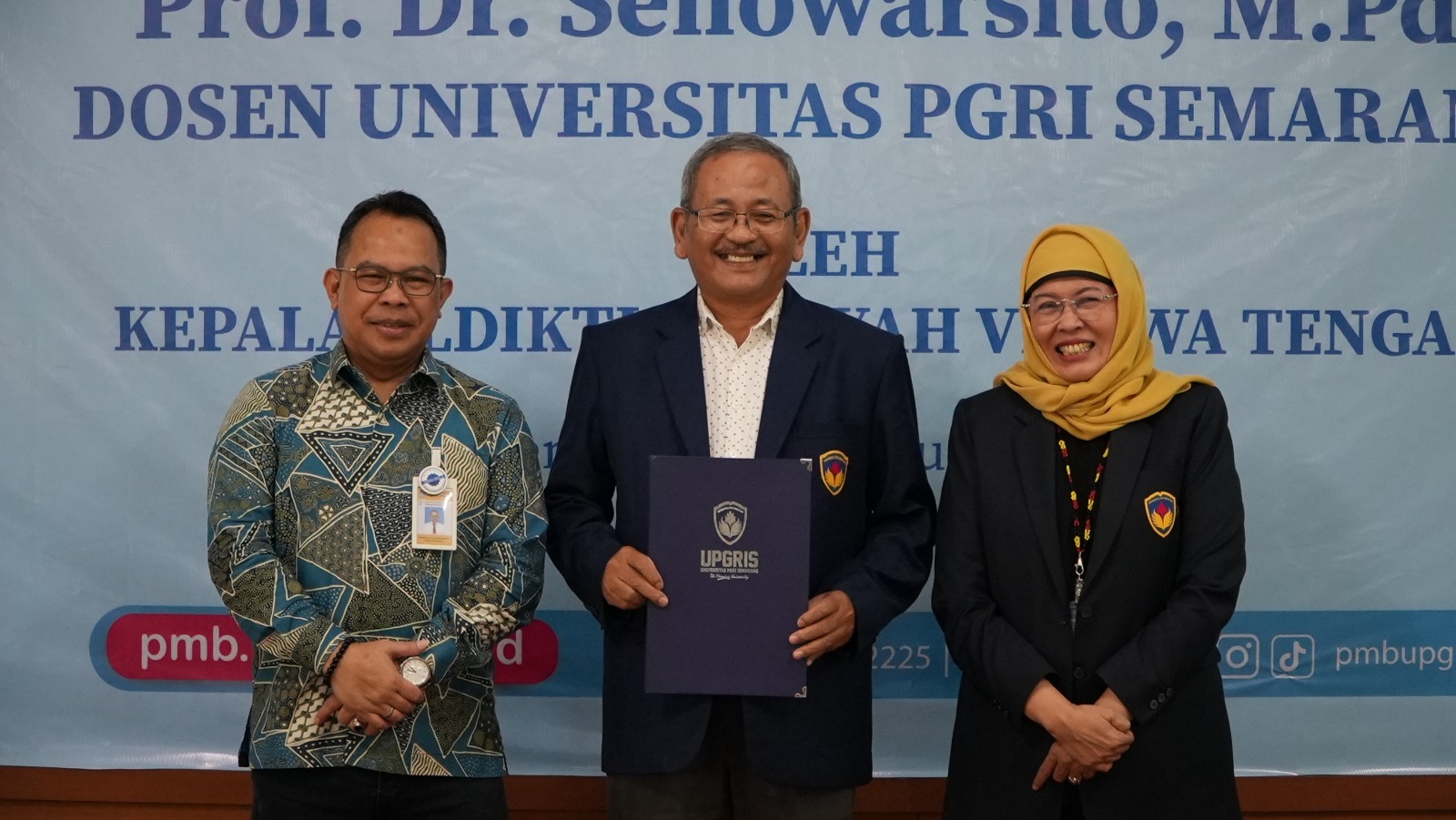 Dosen Pendidikan Bahasa Inggris Universitas PGRI Semarang, Prof. Dr. Senowarsito, M.Pd., meraih gelar Guru Besar bidang Linguistik Terapan. Surat Keputusan (SK) Guru Besar diserahkan langsung oleh Kepala LLDIKTI Wilayah VI Jateng, Dr. Bhimo Widyo Andoko, S.H., M.H., kepada Rektor UPGRIS, Dr. Sri Suciati, M.Hum.