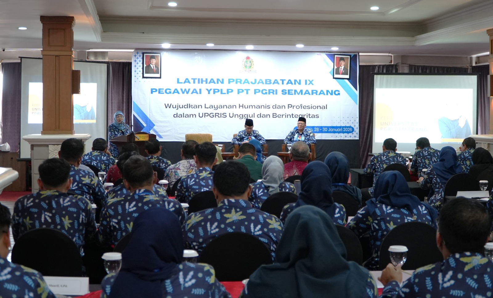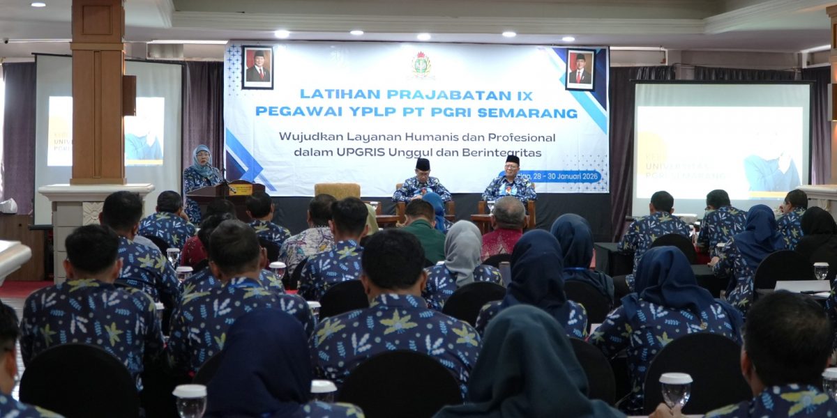 “Keduanya itu penggerak utama. Kinerja dan profesionalisme sumber daya manusia (SDM) tersebut haruslah berjalan searah dengan kebijakan UPGRIS,” ucap Rektor dalam acara Latihan Prajabatan IX Pegawai YPLP PT PGRI Semarang yang diselenggarakan oleh YPLP PT PGRI Semarang pada 28-30 Januari 2026 di Hotel 168 Salatiga.